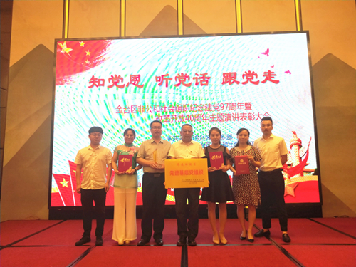 2018年6月28日,由中国宝鸡市金台区委组织部、中共宝鸡市金台区非公和社会组织工作委员会主办,中共宝鸡市金台区非公有制经济组织委员会、中共宝鸡市金台区社会组织委员会承办的纪念建党97周年暨改革开放40周年“知党恩、听党话、跟党走”主题演讲表彰大会在宝鸡市海棠假日酒店召开。 金台区委副书记朱小强同志为本次大会致辞,金台区委组织部副部长、基层办主任周丽红同志宣读《关于全区非公经济和社会组织“党建助脱贫”先进基层党组织、优秀共产党员、“党员人才创新成果”先进个人的表彰通报》,金台区非公党委书记孙向军同志宣读《关于全区非公经济组织和社会组织支持党建工作优秀民营企业家和出资人的表彰通报》,金台区非公经济和社会组织党工委副书记冯全喜同志宣读《全区五星级、四星级非公经济组织和社会组织党组织名单》。 在此次表彰大会中,我公司党支部荣获“党建助脱贫先进基层党组织”称号,公司总经理王睿成荣获“支持党建工作优秀民营企业家和出资人”称号,副总经理李继虎荣获“党员人才创新成果先进个人”称号。 随后,纪念建党97周年暨改革开放40周年“知党恩、听党话、跟党走”主题演讲比赛拉开序幕。来自金台区各非公有制经济党组织及社会组织选送的10位参赛选手进行决赛,各位选手热情洋溢、慷慨激扬的演讲表演引来现场观众阵阵掌声,经过现场评委评定,我公司参赛选手李洁育(固剂车间)荣获三等奖、白丽萍(物资采供部)荣获优秀奖。 在此次表彰大会中,金台区非公党委充分肯定了我公司近年来的党建工作成绩。紫光辰济药业将在今后的工作中,在公司领导班子的支持下,不断努力,改造创新,积极推动党建工作,大力助推帮扶脱贫工作,给予帮扶对象最大的支持,在党员干部中,鼓励大家开拓创新,创造项目新成果。公司将继续加强公司文化活动,提高员工个人技能,以更好地精神面貌以及非凡的个人魅力,去展现属于紫光辰济人的风采。